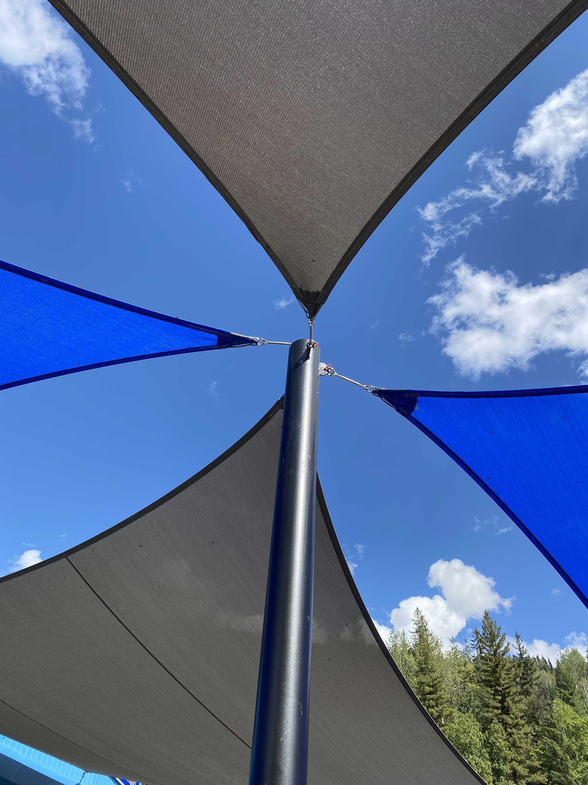These structures are suitable for both small and large areas and are especially visually striking when the attachment heights are varied to create hyperbolic (twisted fabric) shapes. While the posts are permanent, the fabric can be removed during winter or heavy storms.