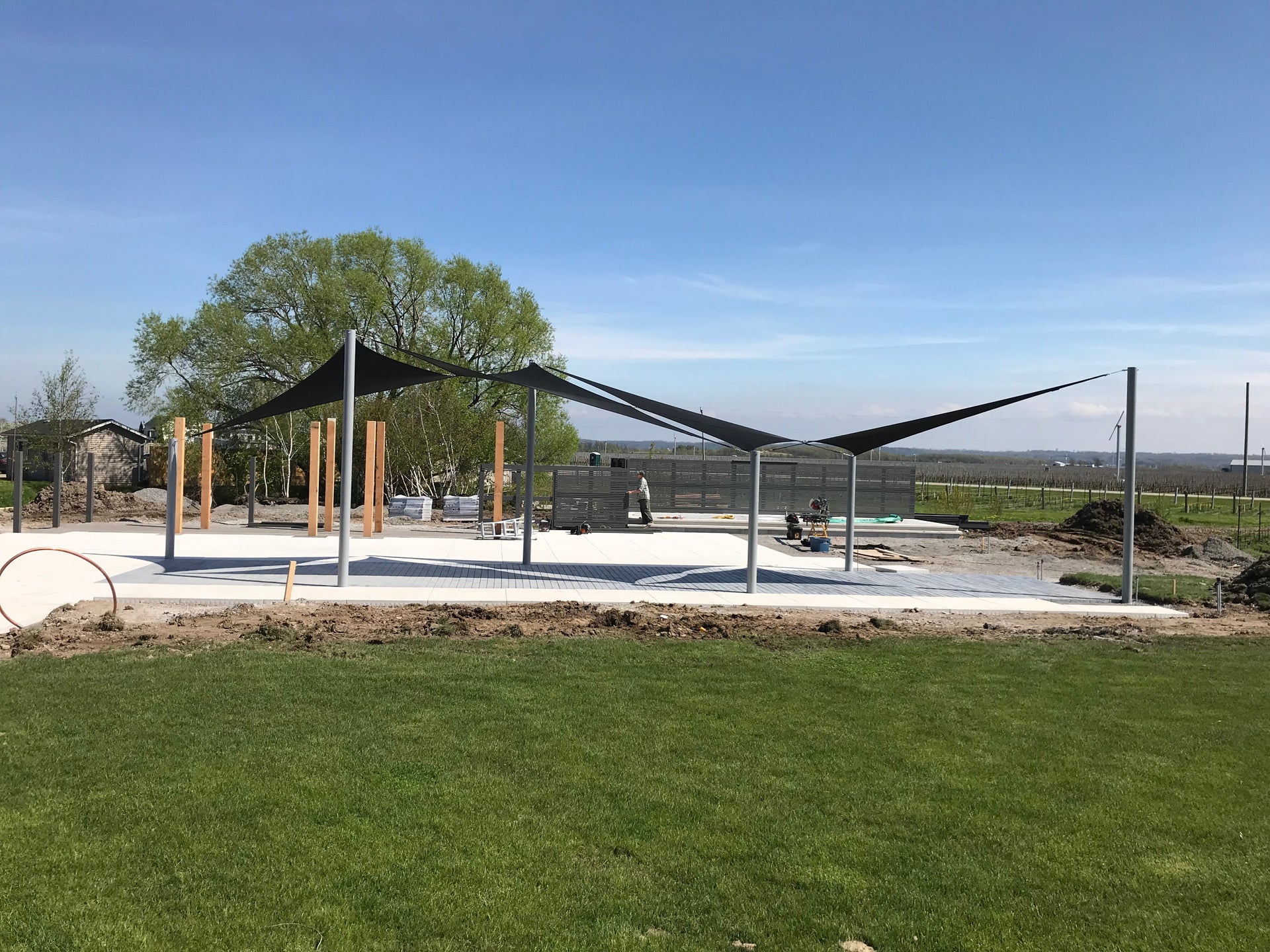 The swift and sharp curves of the Shade Sail array were first created by our design team using a 3D rendering software. The beautiful design incorporates interlinked triangle Shade Sails to cast shadows on the ground that are reminiscent of grapes on the vine! Once the design was approved, the installation of the posts and stunning Shade Sails resulted in an outdoor space that matches the spirit of Wayne Gretzky Estates and The Great One himself.