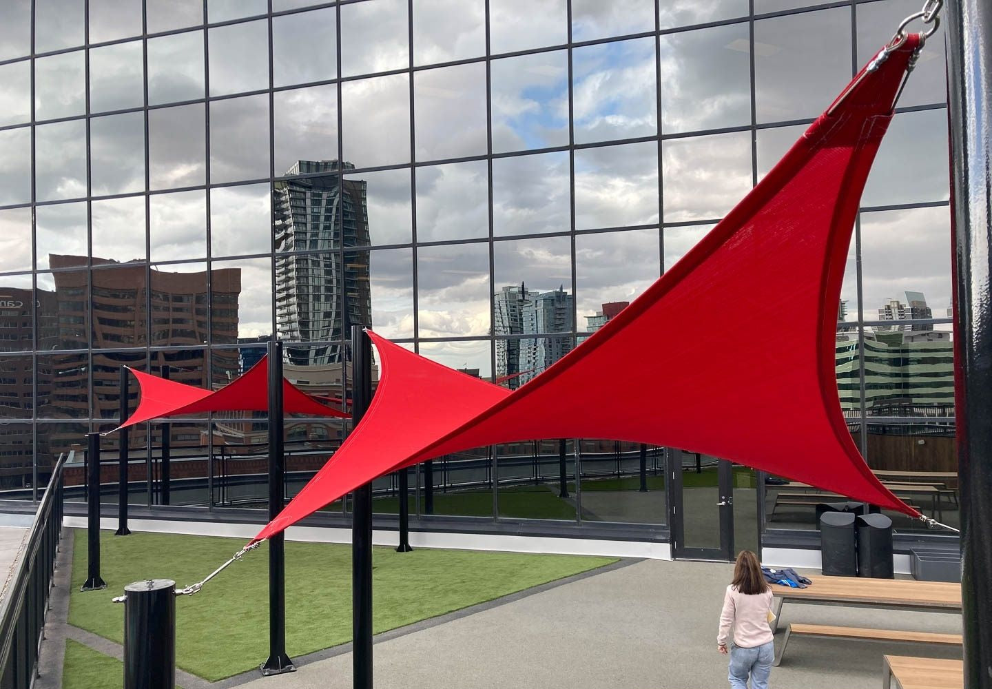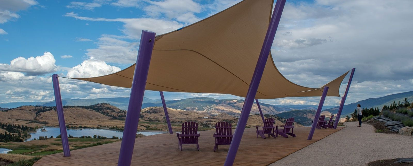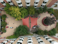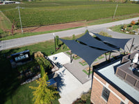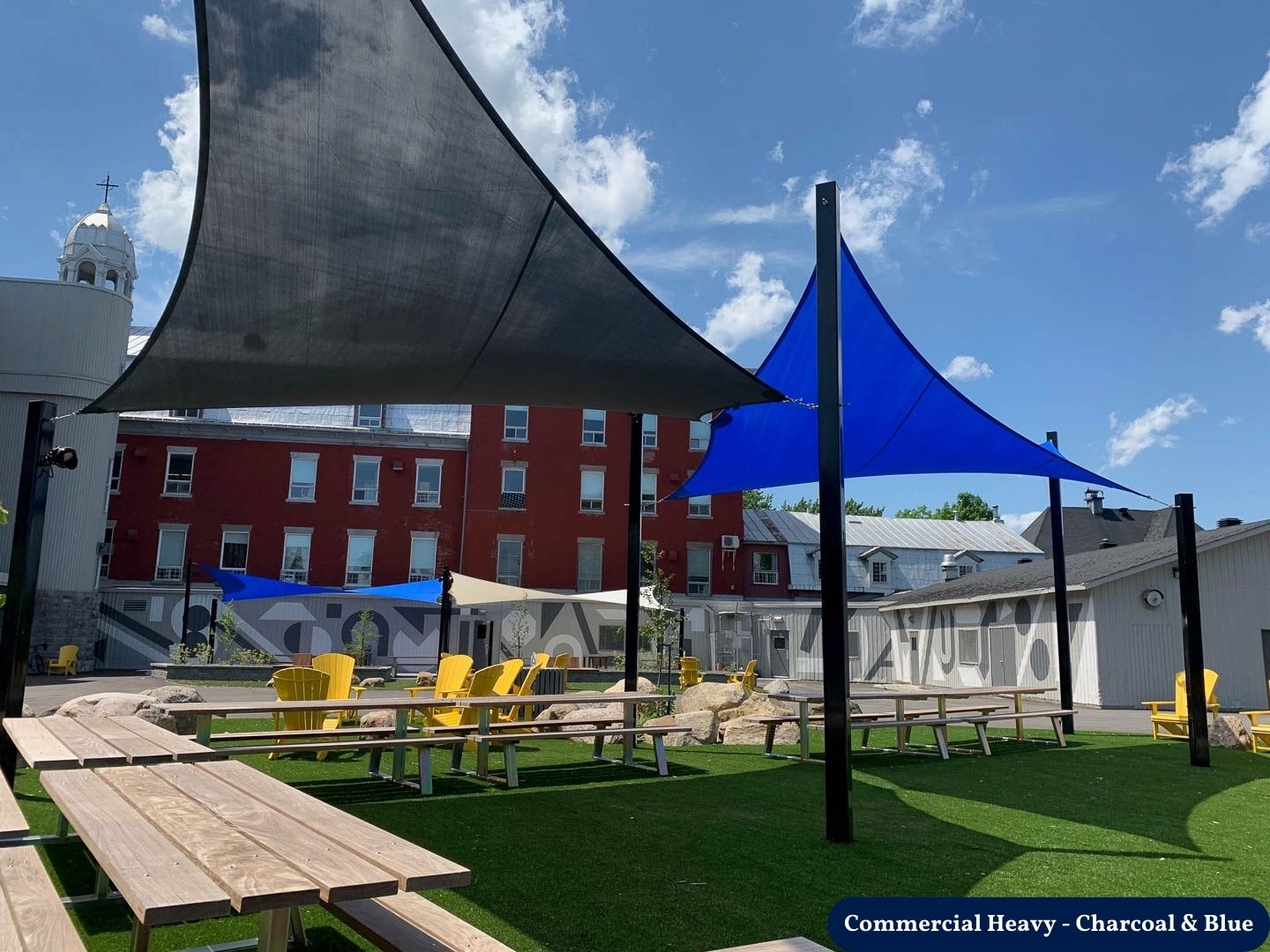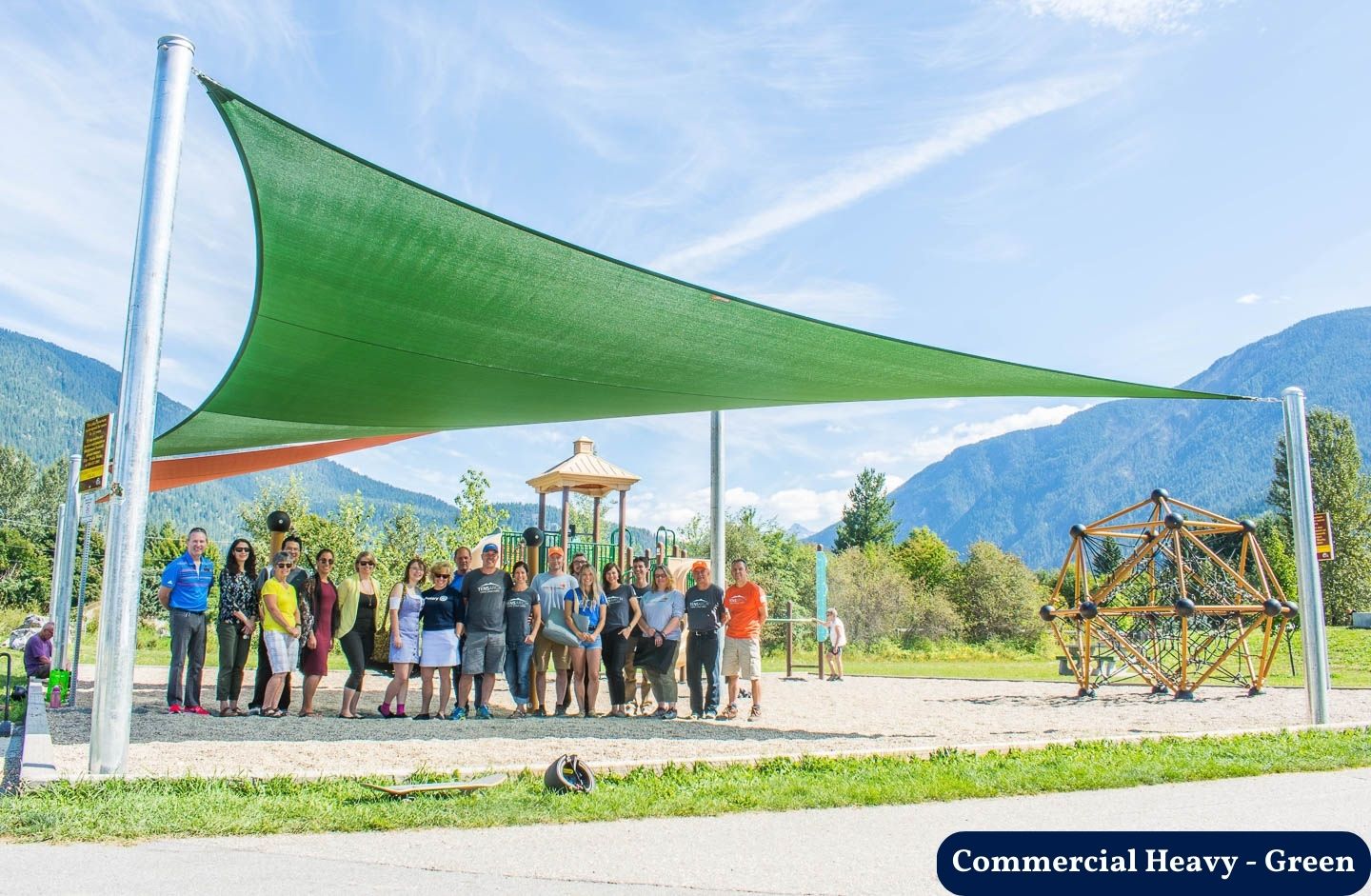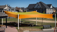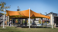 These structures are suitable for both small and large areas and are especially visually striking when the attachment heights are varied to create hyperbolic (twisted fabric) shapes. While the posts are permanent, the fabric can be removed during winter or heavy storms.