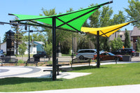A Hypod is a hyperbolic shade sail mounted within a single-mast steel frame. It offers the striking visual appeal of a free-span fabric structure while minimizing footing requirements.