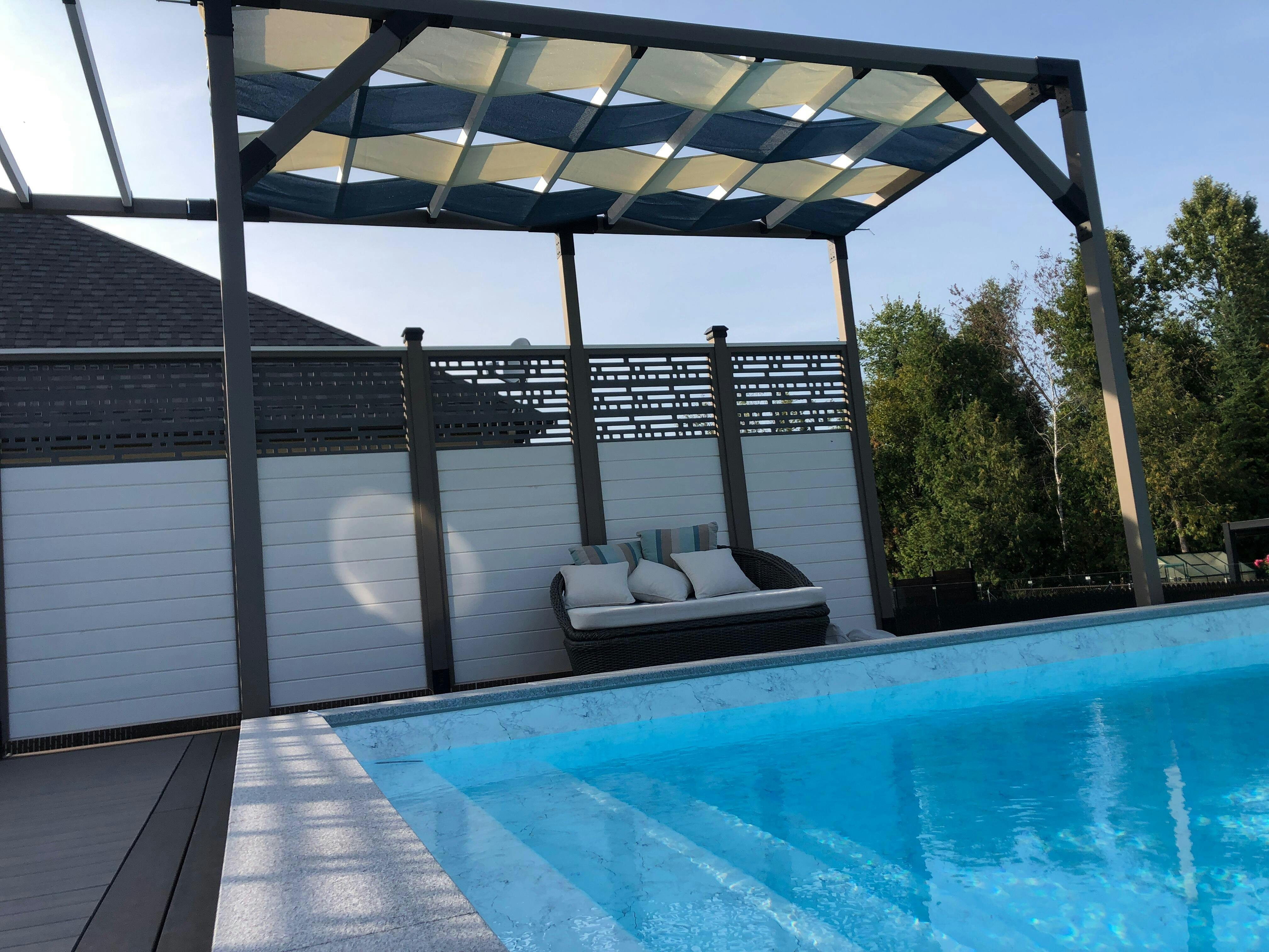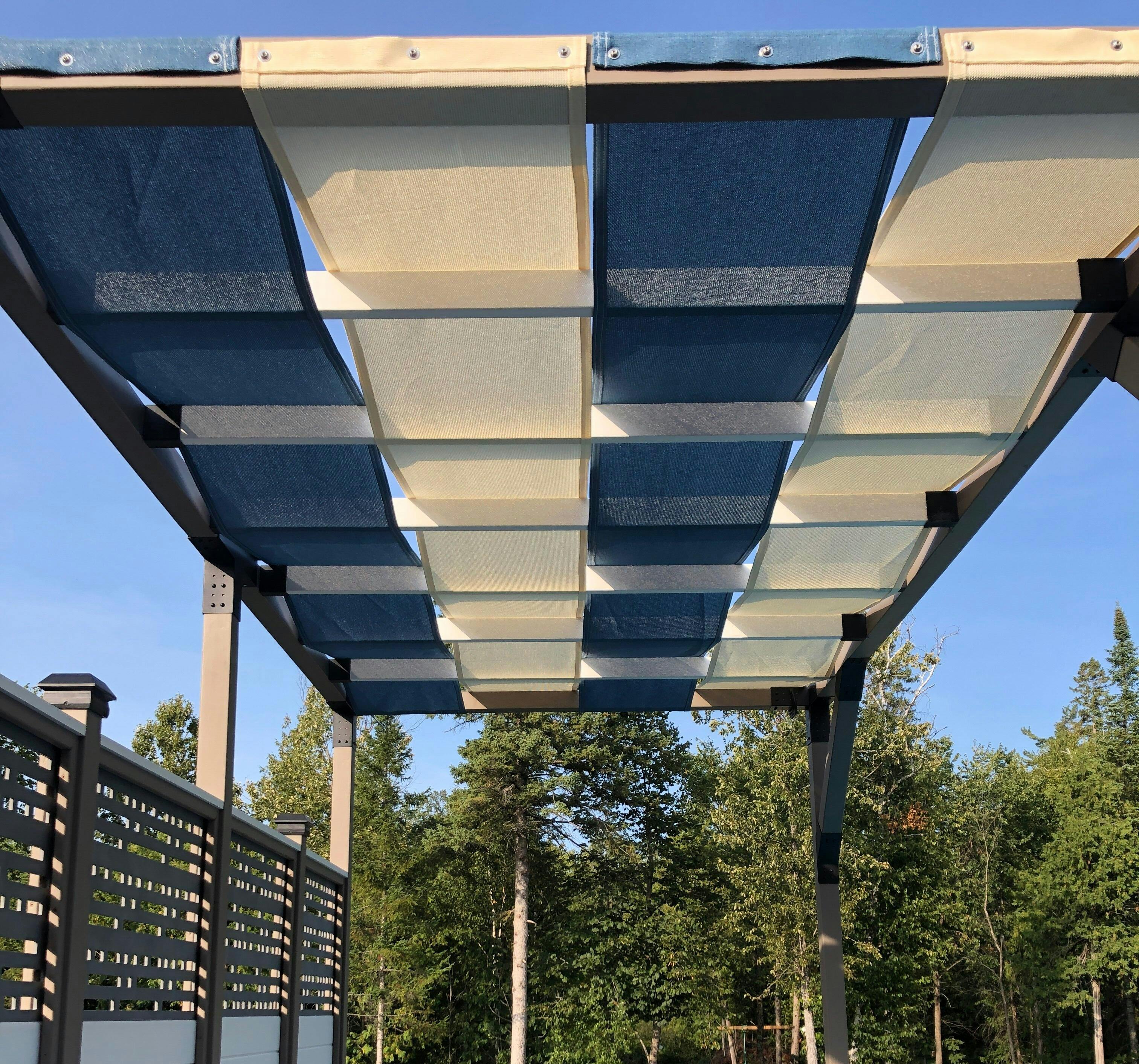 - Includes double-stitched seams, triple-layer reinforced grommeted ends, and Stainless Steel mounting hardware designed specifically for wooden pergolas.